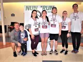 Nun Run 2023 participants enjoyed an unexpectedly bright morning on Saturday, April 29. Although clouds brought rain which forced our festivities inside, laughter and joy shined brightly – our Nun Run participants truly made their own sunshine!